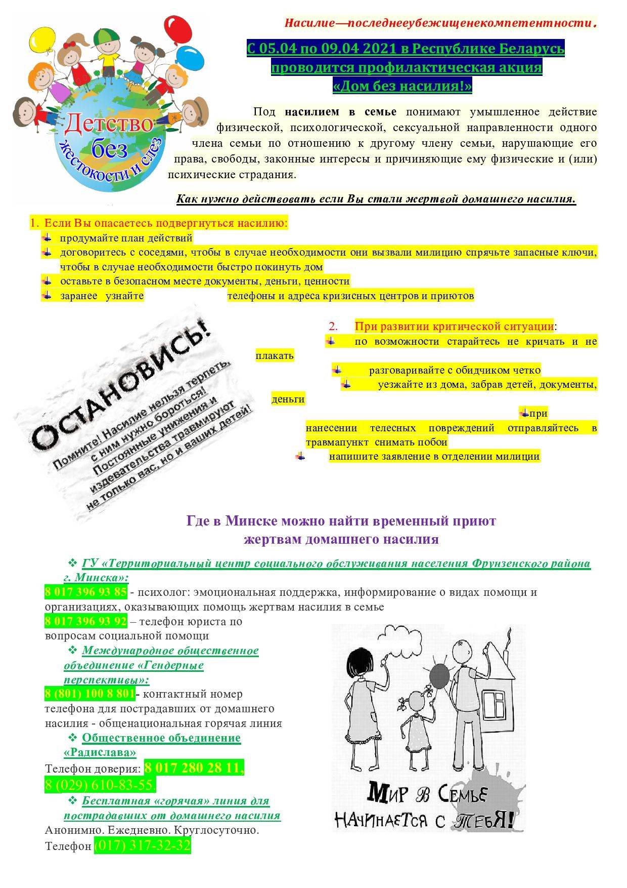 С 05.04 по 09.04.2021 в Республике Беларусь проводится профилактическая акция «Дом без насилия!»