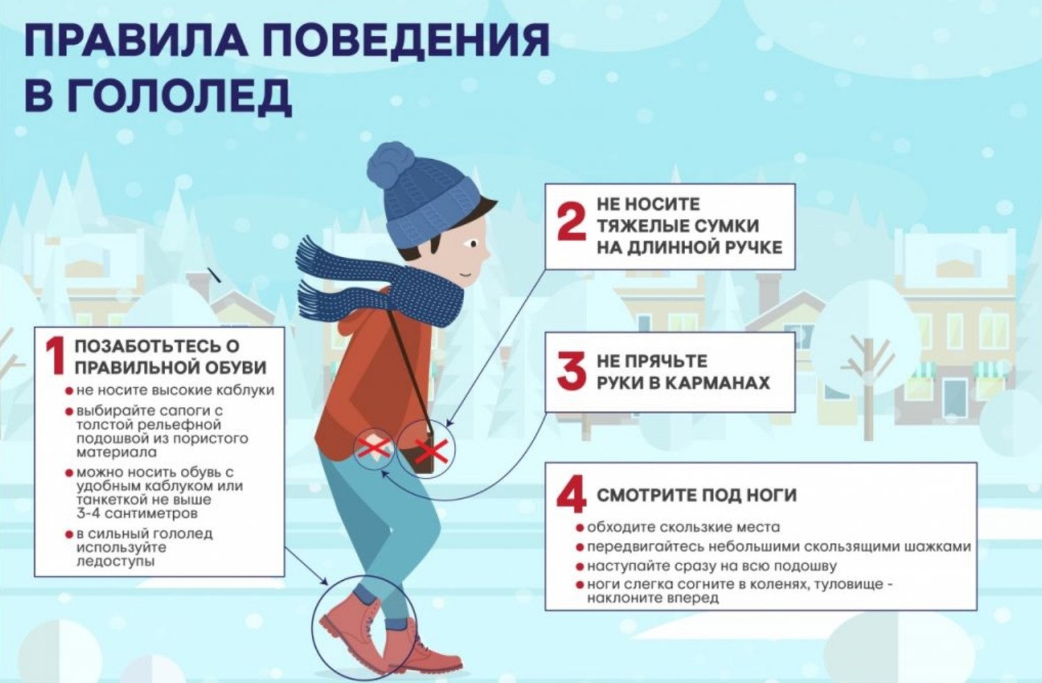 Ходите не спеша, ноги слегка расслабить в коленях, ступать на всю подошву. Руки должны быть не заняты сумками. Помните, что спешка увеличивает опасность гололеда, поэтому выходите из дома не спеша.