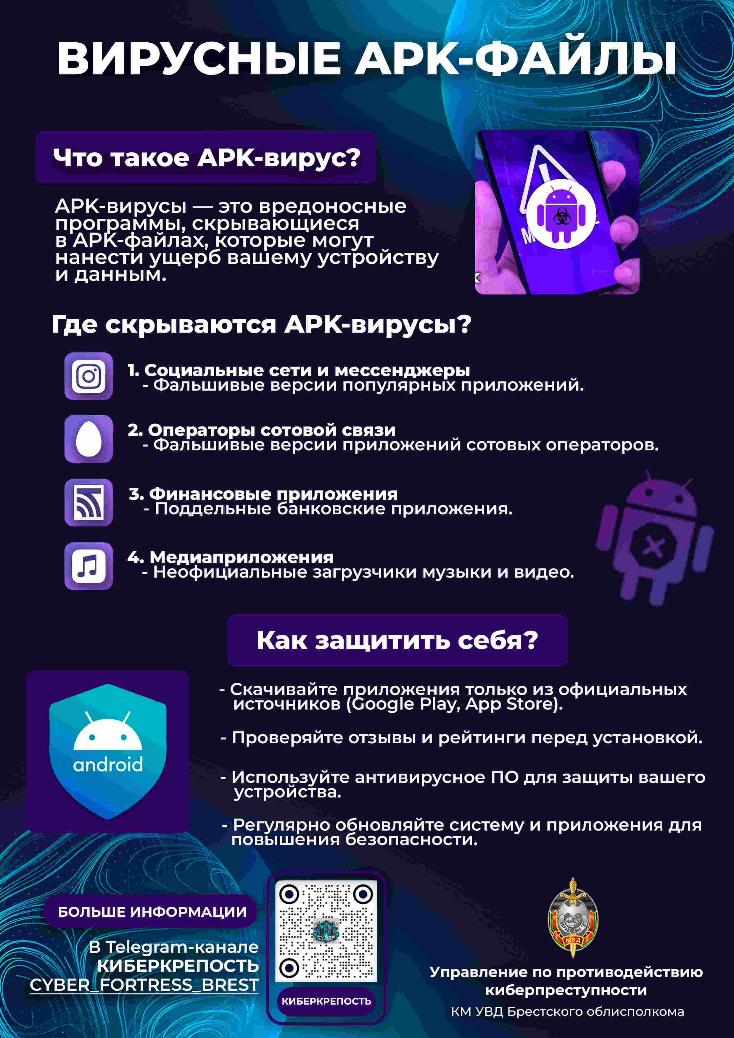 Мошенничество с использованием мобильной связи. Мошенники представляются сотрудниками операторов сотовой связи (А1, МТС). Под предлогом окончания срока действия договора или необходимости обновления услуг они убеждают жертву перейти по ссылке из мессенджера и скачать поддельное приложение. Такие приложения дают злоумышленникам полный доступ к данным на смартфоне, включая коды из SMS, логины и пароли к онлайн-банкингу. Важно помнить: безопасное скачивание приложений возможно только из официальных магазинов, таких как Google Play, App Store, App Gallery. Никогда не устанавливайте приложения, переходя по сомнительным ссылкам.