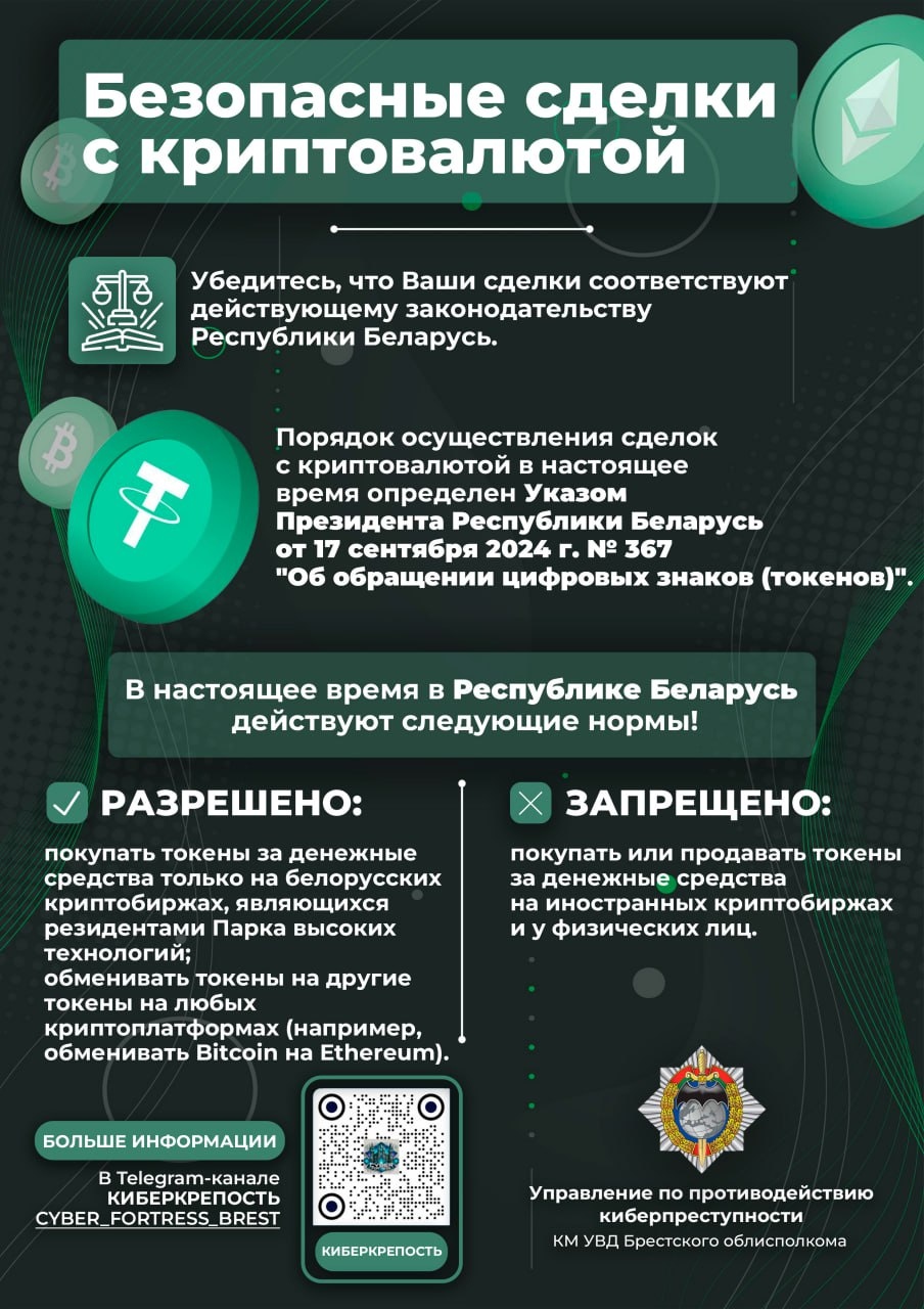 Регулирование оборота криптовалюты в Республике Беларусь. Операции по покупке и продаже криптовалюты за денежные средства (белорусские рубли, иностранная валюта или электронные деньги) разрешены только через криптобиржи (операторов обмена криптовалют), являющихся резидентами Парка высоких технологий. Запрещены и являются незаконными операции по купле-продаже криптовалюты на иностранных криптобиржах и у физических лиц. Порядок осуществления сделок с криптовалютой регулируется Указом Президента Республики Беларусь от 20.09.2024 № 367, за нарушение которого предусмотрена ответственность по ч. 3 ст. 13.3 КоАП, предусматривающей штраф с конфискацией всей суммы дохода.